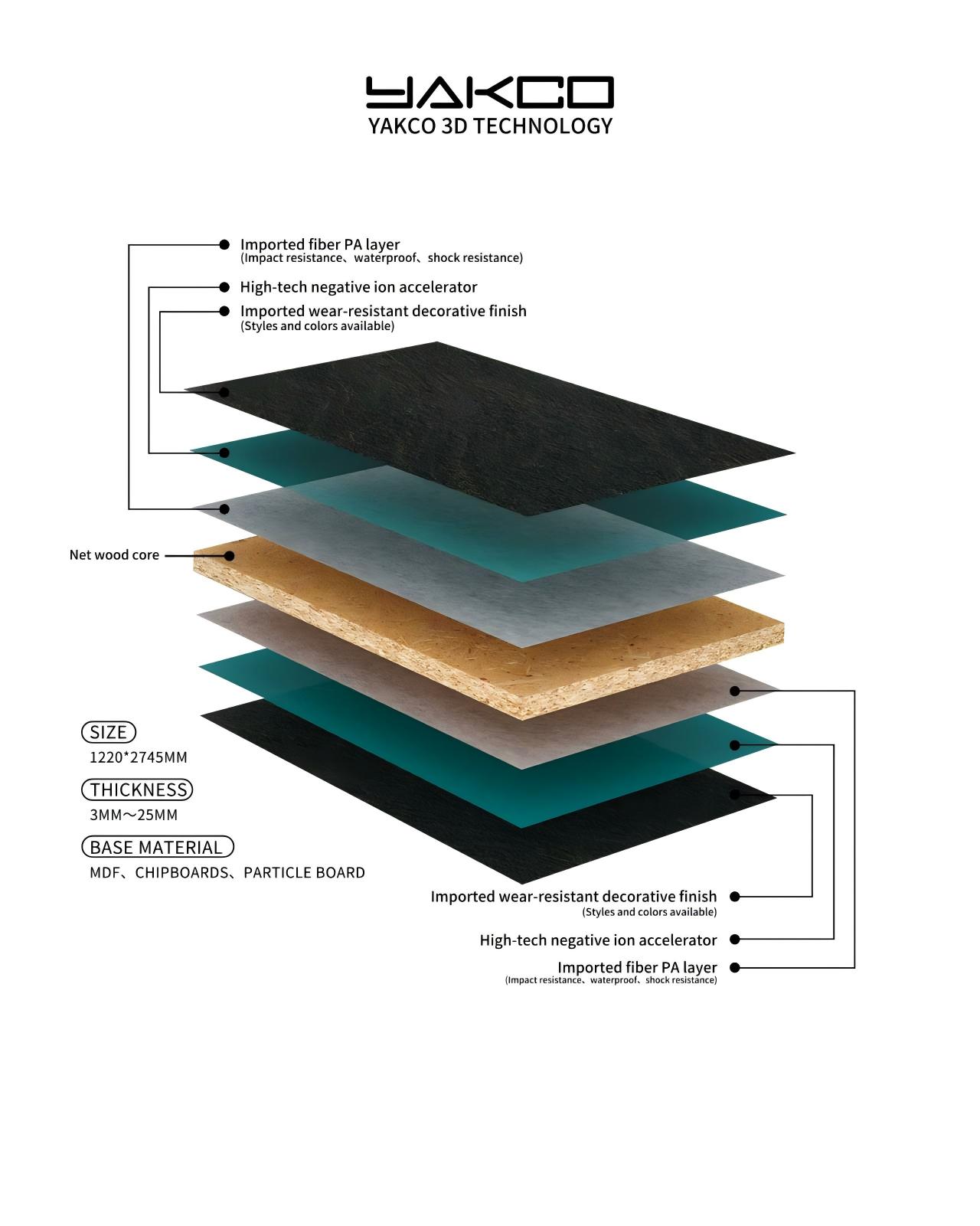Prestasi alam sekitar yang unggul: Yake memberi perhatian kepada keramahan alam sekitar produknya. Panel hiasan 3D mengguna pakai bahan dan proses mesra alam dalam proses pengeluaran, memenuhi piawaian alam sekitar yang tinggi seperti ENF standard kebangsaan baharu dan piawaian ujian bintang F-4 Jepun, memberikan pengguna bahan hiasan dalaman yang sihat dan selamat.